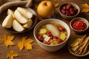 この免疫力アップスープに使われる食材は、それぞれが独自の栄養と効能を持ち、相乗効果で私たちの健康を支えます。特に、「気(エネルギー)」「血(栄養)」「水(体液)」のバランスを整える薬膳の考え方に基づくと、これらの食材は秋の体にぴったりの選択です。
